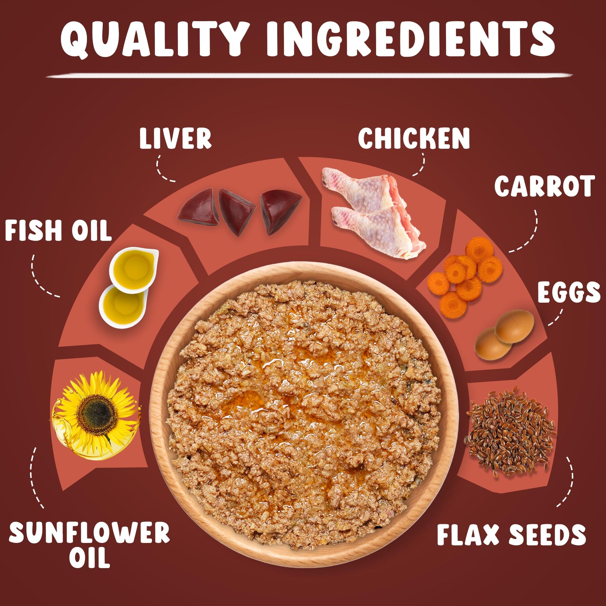 Each pouch is made using Human-grade ingredients: Liver, Chicken, Eggs, Carrots, Sunflower Oil, Flaxseeds, and Fish Oil – and absolutely nothing else. No fillers, no by-products, no compromises. Just clean, complete, and balanced nutrition.