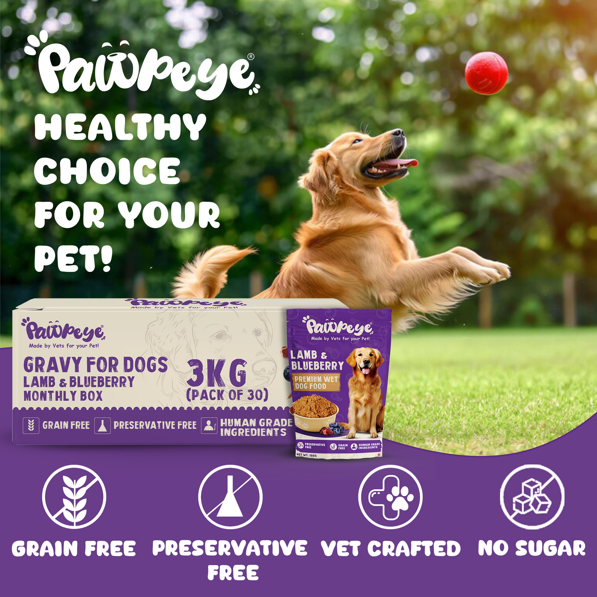 Pawpeye Wet Dog Food Monthly Box(Pack of 30)-Lamb & Blueberry Flavour | 100g each | for Adult Dogs & Puppies | Vet-Formulated, Human-Grade, Grain & Preservative-Free, 100% Natural